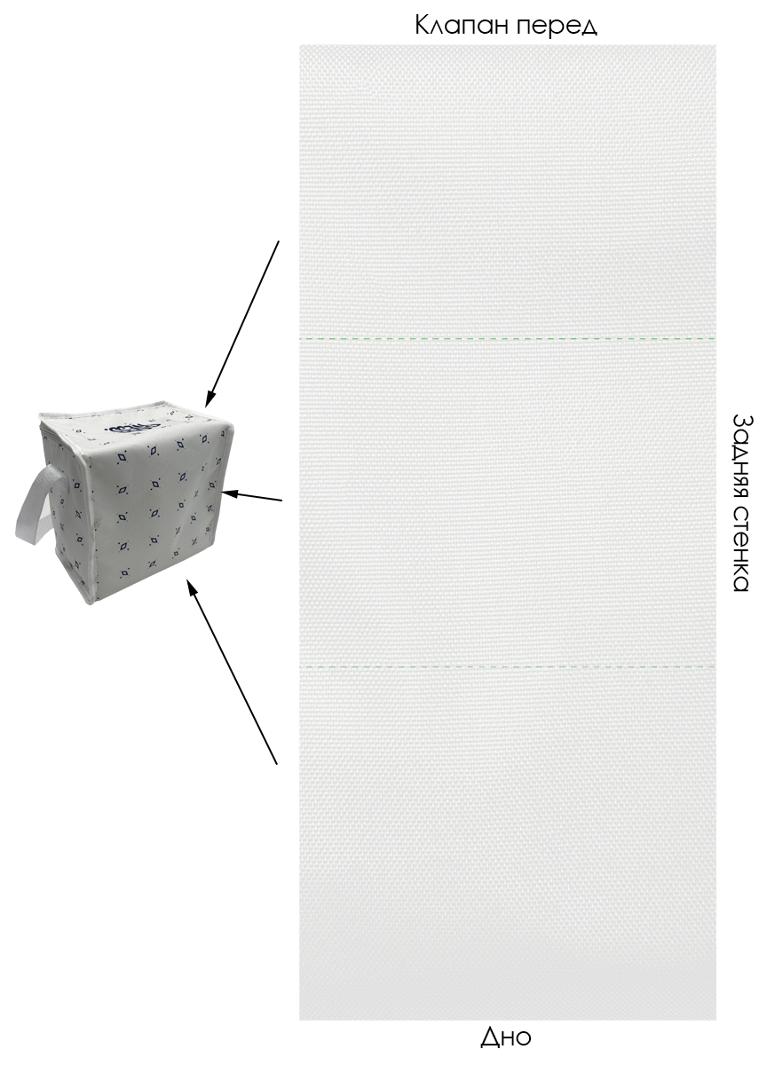 Модель. Сумка объемная, прямоугольной формы. В качестве подклада используется фольгированный изолон. Ручки выполнены из стропы стандартных цветов. В качестве застежки используется молния стандартных цветов. Сумка обработана по краю окантовочной лентой стандартных цветов.