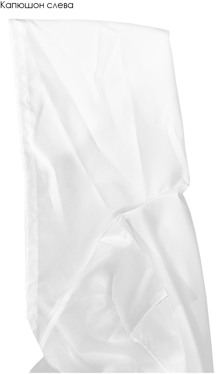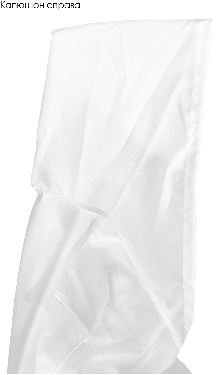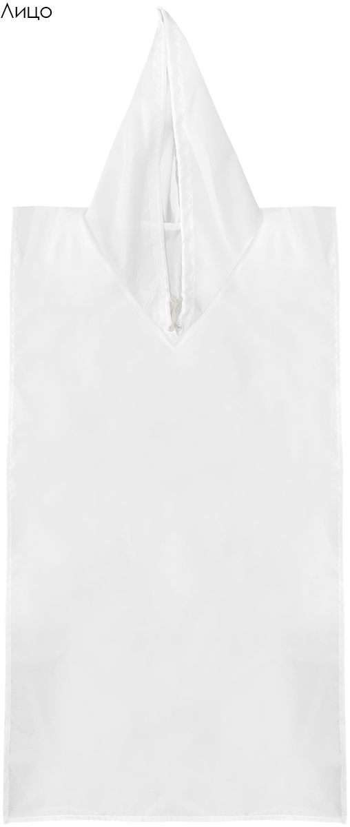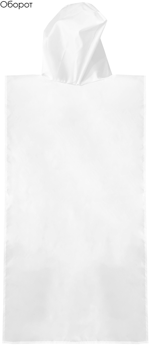 Модель: Накидка прямоугольной формы с капюшоном, без карманов. По желанию клиента накидка может быть пошита с одним карманом 20х25 см, либо двумя карманами 13х16 см (оплачивается дополнительно). Капюшон пришивной, фиксируется на кулису из полиэфирного шнура стандартных цветов. Края накидки обрабатываются швом вподгибку. Завязки выполнены из брючной ленты белого или черного цветов. Длина завязок 34 см.