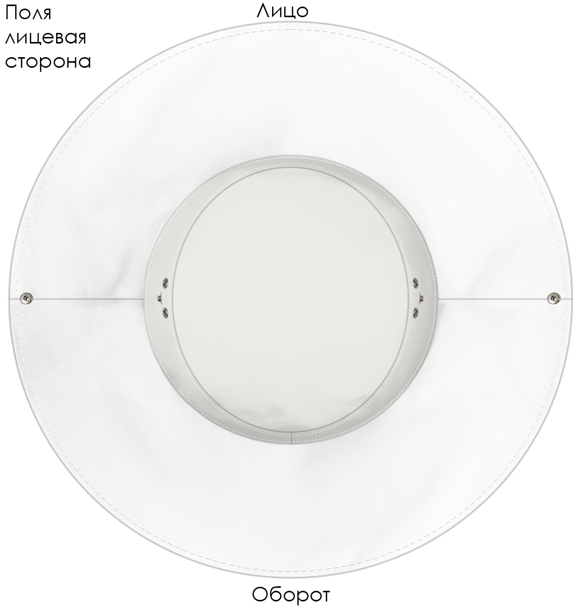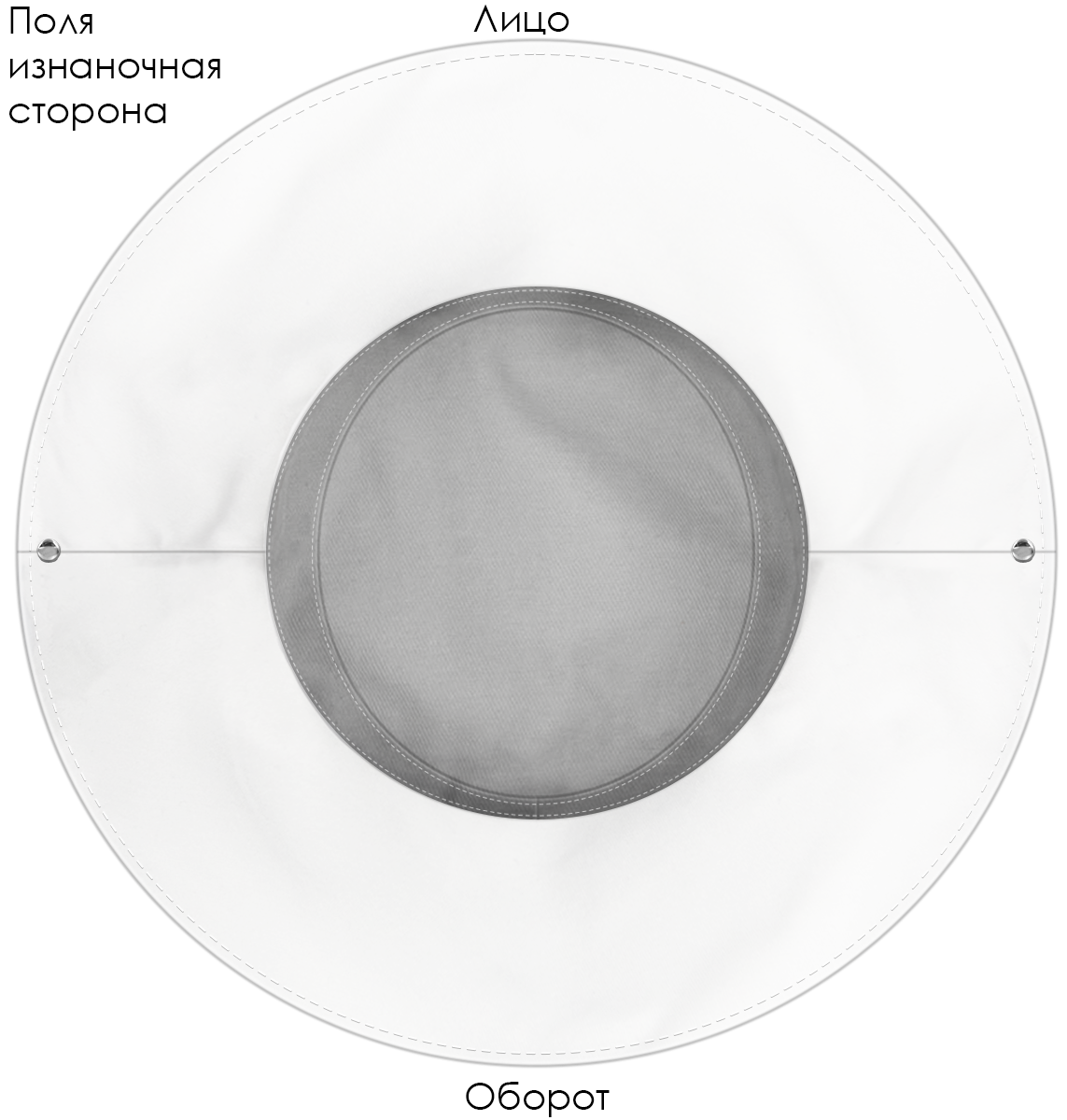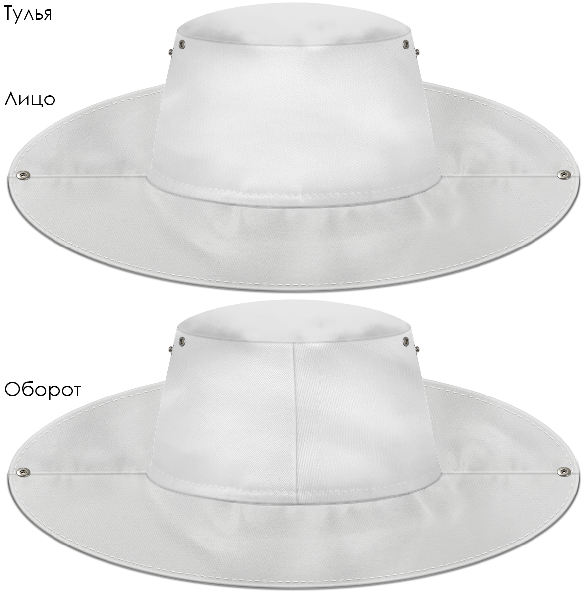 Модель. Панама с подкладом. Поля панамы фиксируются кнопками по бокам. На голове панама регулируется плетено-вязаный или полиэфирным шнуром с фиксатором стандартных цветов.