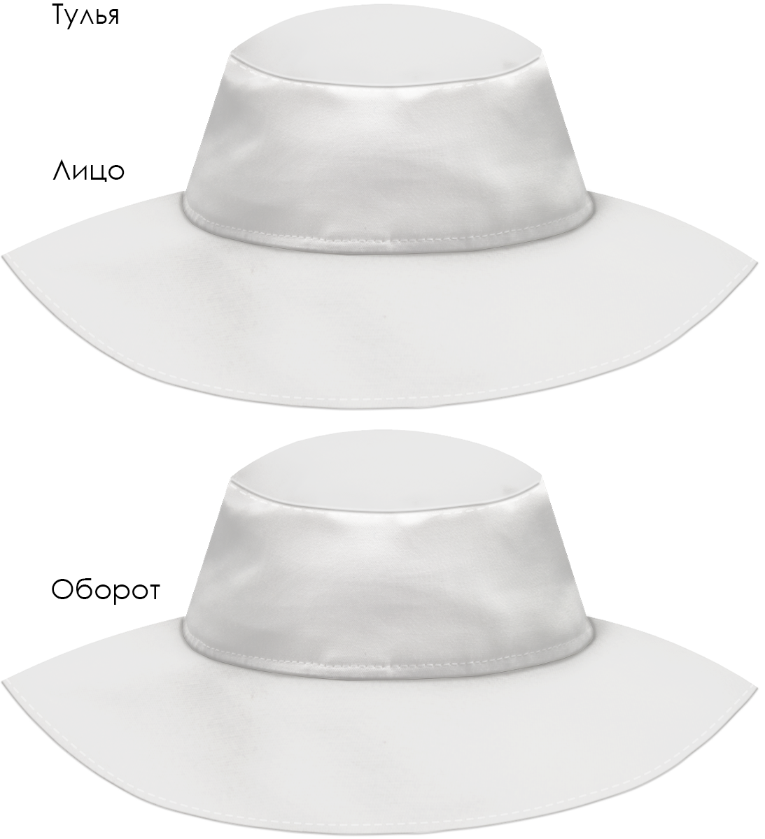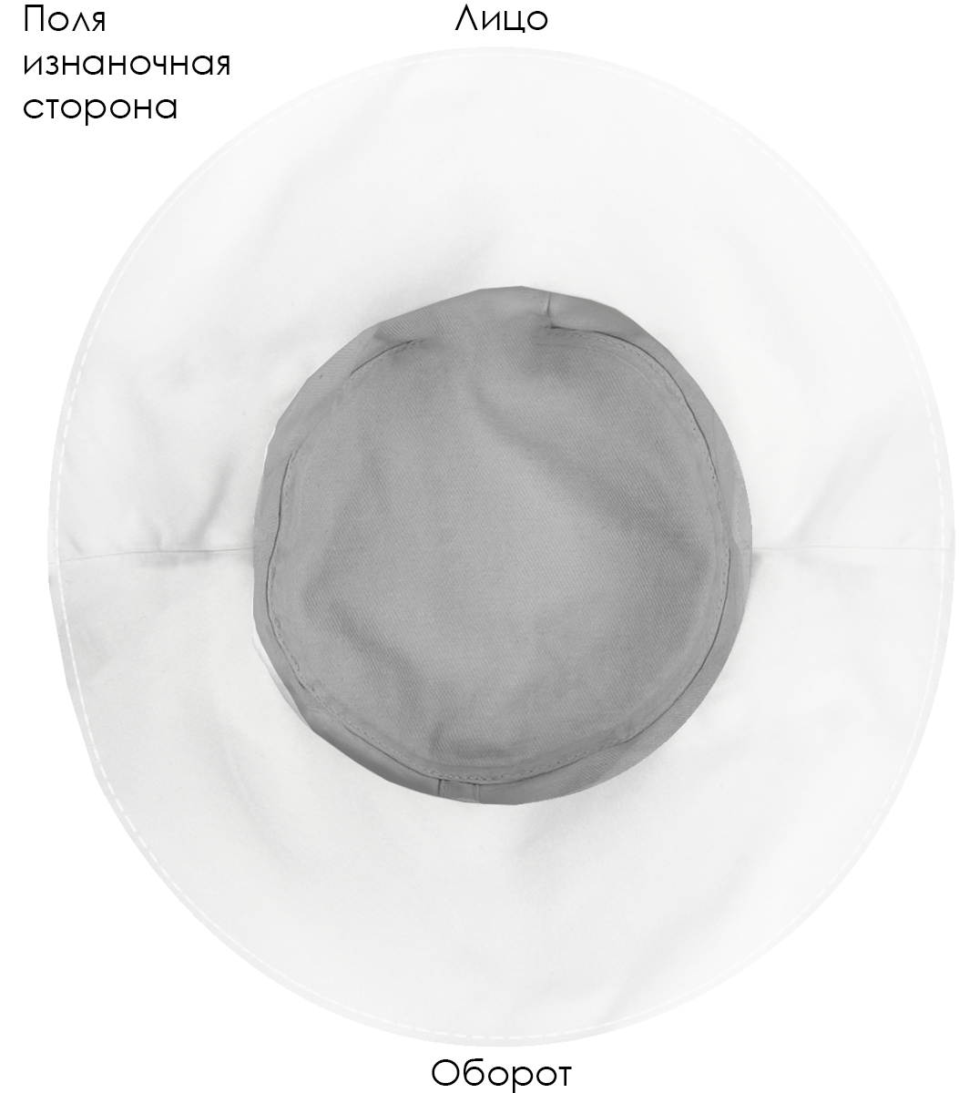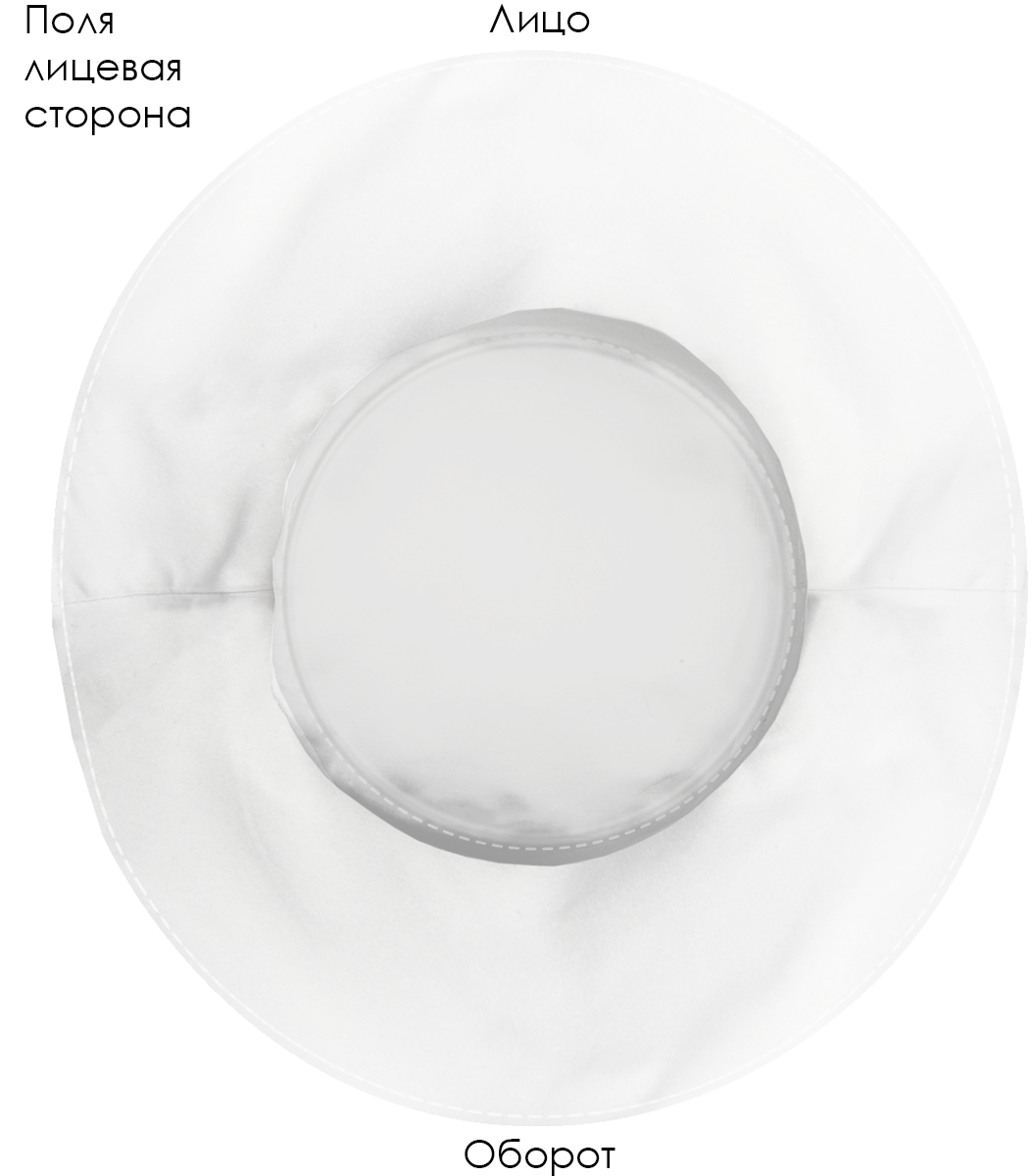 Модель. Панама состоит из семи деталей: дно, 2 тульи, 4 поля (2 верхних, 2 нижних). Поля дублированы специальной подкладкой для удержания формы. Ширина поля 10 см. Панама без подклада.
